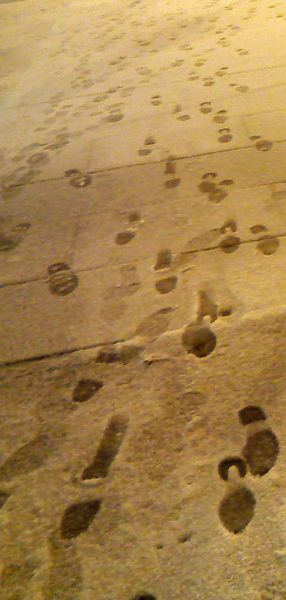 我走在DC初雪的街上,天漸漸暗了,而昏黃的燈就灑在剛蓋上薄雪的人行道上,不久前行人的腳印深淺不一地鋪陳在我眼前,寥寥地一排一排或交叉或重疊,都像遇到我正困擾著的冷風,每排腳印都是那麼急切地計算走完這段薄雪的最短路徑,筆直地又精準地繞過凹凸的路障,沒有平行的另外一排腳印,都像是獨自趕路,都像,我。