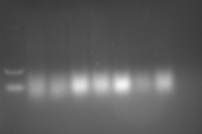 所有的血淚最後都濃縮成一張小小的圖(見上圖),謝天謝地RNA最後安然地出現在照片裡,最後一天半夜,實驗室四下無人,看著那張巴掌大的照片我幾乎要手舞足蹈得意忘形起來了,一張小小的照片承載著算算幾乎是八個月的血淚啊,拿著那麼輕,可是在我的眼裡又可以這麼重。勉力鎮定地傳了一封信給先回家的Stu和遠在英國度假的老闆之後,回家安穩地睡了一覺。這次的前製工作,耗時了八個月的青春,總算完美落幕。